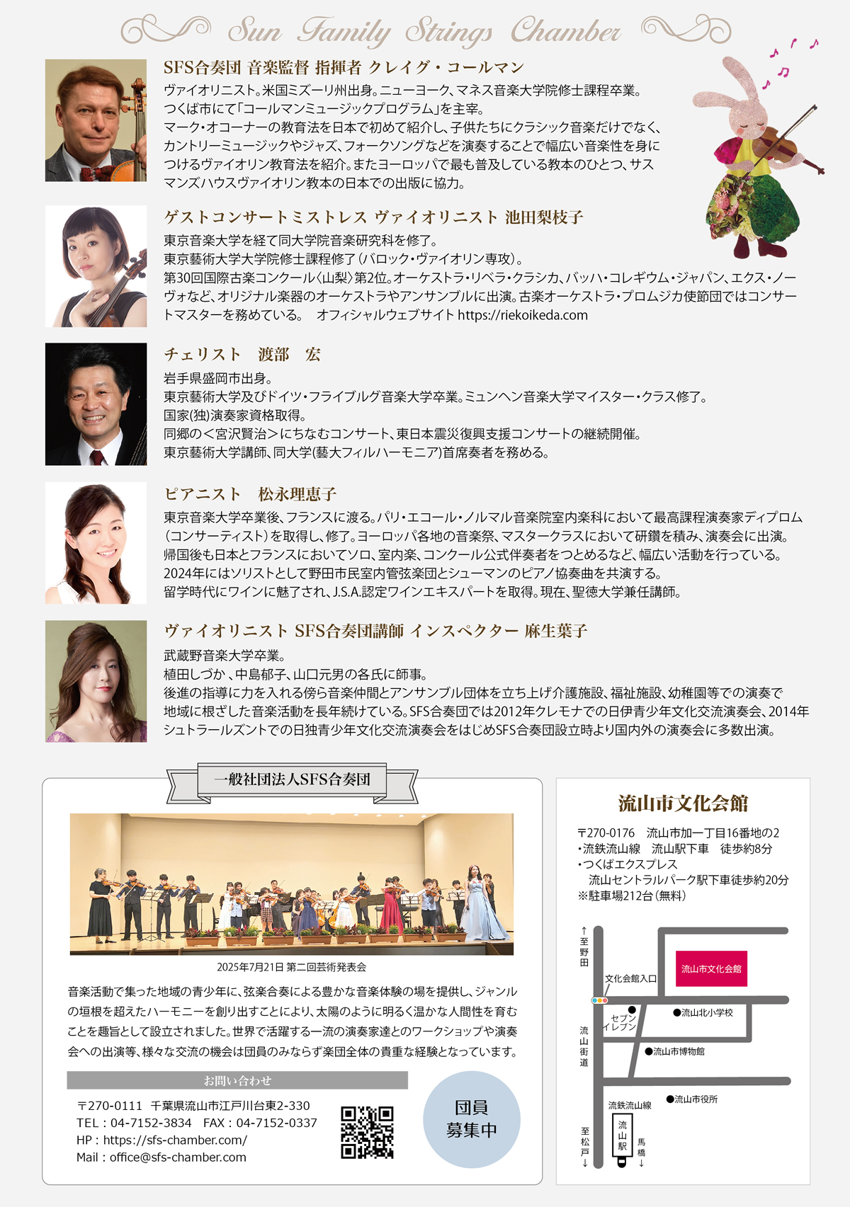 一般社団法人SFS合奏団は地域で音楽活動している青少年が集い、バイオリン等弦楽合奏による豊かな音楽体験の場を提供し、ジャンルの垣根を超え創り出されるハーモニーにより、太陽のように明るく温かな人間性を育みます。小学生から22歳までの年齢層を対象にした楽団員とその父兄で構成される会員組織で運営されています。千葉県流山市で主に練習をしています。