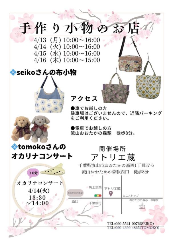 「手づくり小物のお店」がおおたかの森の「アトリエ蔵」にて